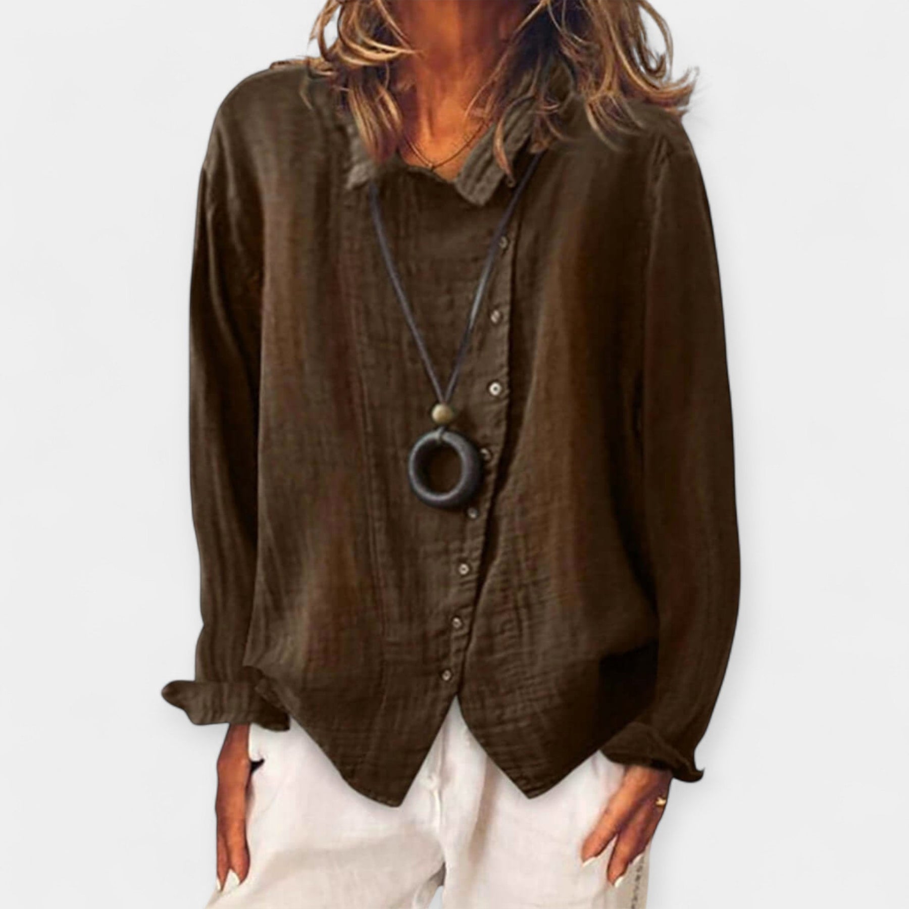 Fremstillet af en let blanding af bomuld og hør for komfort og stil uden besvær. Med en afslappet H-line silhuet og lange ærmer, er den ideel til forårs- og sommerdage. Kombiner den med leggings, jeans eller bær den alene for et ubesværet, men velplejet look.